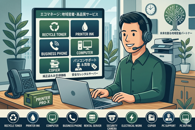 エコマネージは、地域に根ざした信頼のパートナーとして、環境に配慮したリサイクル製品から高品質な純正アイテムまで、幅広いニーズに応えるサービスを展開しています。