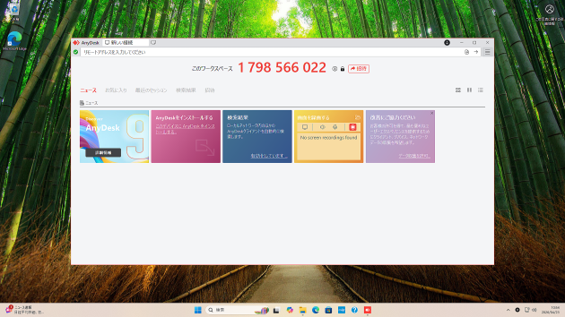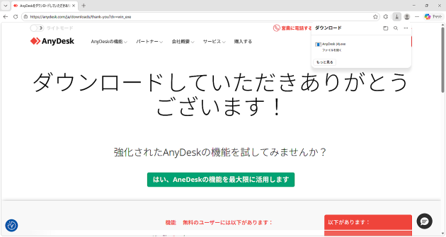 ブラウザの右上などに表示されるダウンロード履歴から、保存された「AnyDesk.exe」をクリックして実行します。