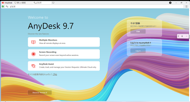 AnyDeskが起動し、初期のウェルカム画面が表示されます。そのまま次の画面へ進みます。